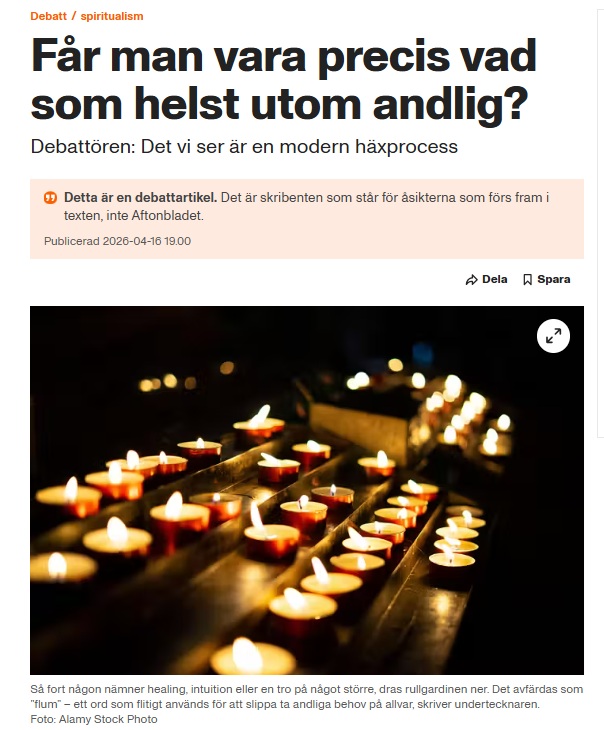 Därför är det uppfriskande med röster som faktiskt försvarar rätten till den andliga världsbilden offentligt. I den skarpa debattartikeln ”Får man vara precis allt utom andlig?” i Aftonbladet skriver Lall Asp: ”Det vi ser är en modern häxprocess maskerad till klinisk logik. Istället för att bränna böcker eller människor, isolerar vi dem på kontor och hotar dem med ekonomisk ruin. […] Det är dags att vi försvarar rätten att vara en sökande människa i det offentliga rummet – utan att hotas av social utfrysning. Andlighet är inte ’flum’. Det är en central del av den mänskliga erfarenheten. Och förtrycket av den måste få ett slut”.