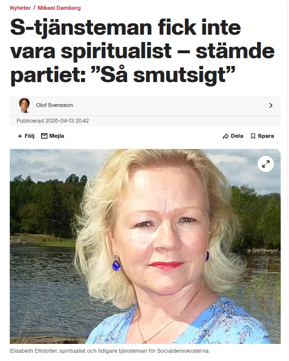 Frågan om andlighet som grund för diskriminering är högst aktuell då mediet och tidigare tjänstemannen inom Socialdemokraterna Elisabeth Ellidotter Gyllenhammar nu befinner sig nu i en rättslig process efter att hennes tidigare arbetsgivare Socialdemokraterna meddelade henne att de inte kunde acceptera att hon arbetade som medium vid sidan om sitt yrke som tjänsteman. Motiveringen var: ”Vi ser bisysslan som en medial risk.” På vilken grund gör de detta uttalande? Det finns ingen annan grund än fördomar mot människor som inte inordnar sig i den strikt materialistiska världsbilden.